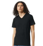 American Apparel Adult 4.6 Ounce CVC V-Neck Short Sleeve T-Shirt. 60% Combed Ring Spun Cotton, 40% recycled polyester. 4.6 ounces. Non-topstitched, narrow width, rib collar. Taped neck and shoulders for comfort and durability. Relaxed fit, side seamed body. Recycled tear away label.